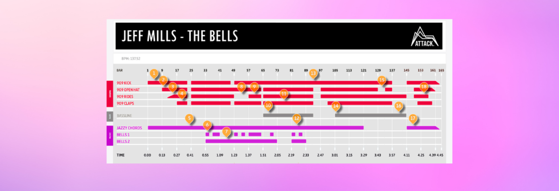 ‘The Bells’ is one of the most iconic techno tracks ever recorded yet it has an unusual, two-part arrangement. It’s also something of a contradiction. It’s minimal in arrangement, with never more than a few musical elements happening at a time, yet also maximalist in energy. It also has a rather unique structure, with the first half dominated by a musical motif and the second by the bassline. It’s a real puzzle box.