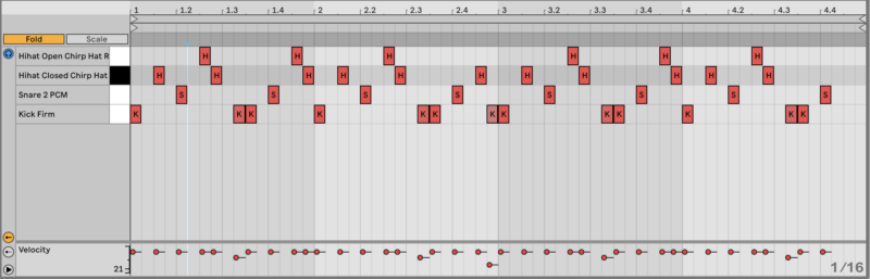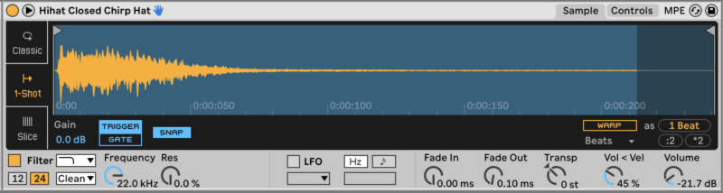 Load them both in Drum Rack. Reduce the gain of ‘Hihat Closed Chirp Hat’ to -21.7 dB.
