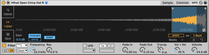 Next up, hi-hats. We’ll need two different samples for the hi-hats in this pattern: ‘Hihat Closed Chirp Hat’ and ‘Hihat Open Chirp Hat R’.