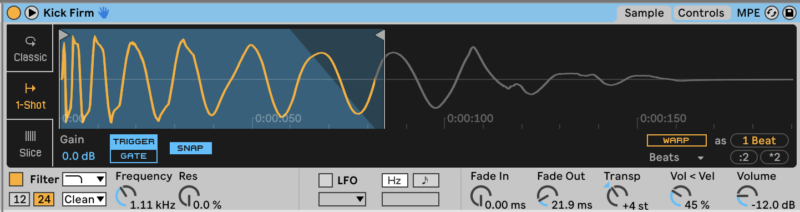 We’ll start building out the beat with a kick drum. Load the sample ‘Kick Firm’ in Drum Rack, pitch it up four semitones, trim off the sample’s end half, and filter out all frequencies above 1.11 kHz.