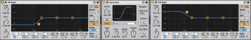 First, we want to apply some saturation. Load Saturator, select the Medium Curve model and set drive to 16dB. To stop the bass frequencies in our beat from being oversaturated, apply a low shelf cut of -7.5dB at 153Hz with EQ Eight before Saturator. After Saturator we can then reintroduce the bass frequencies using EQ Eight – this time create a low shelf boost of 7.5dB at 153Hz after Saturator.