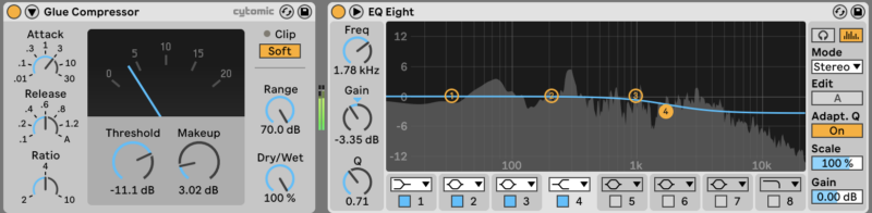Next, apply a Glue Compressor. With an Attack of 3, aim for a gain reduction of around -10dB. To stop the beat from being too abrasive, apply a high shelf cut of around -3.3dB at 1.8kHz.