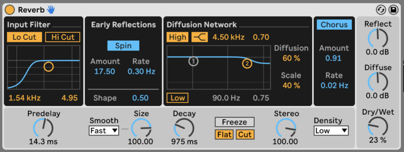 Finally, bring it all together with Reverb. Set a Decay of 975ms, cut the low frequencies out of the reverb, and set a Dry/Wet mix of 23%.