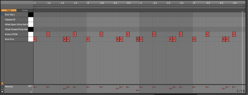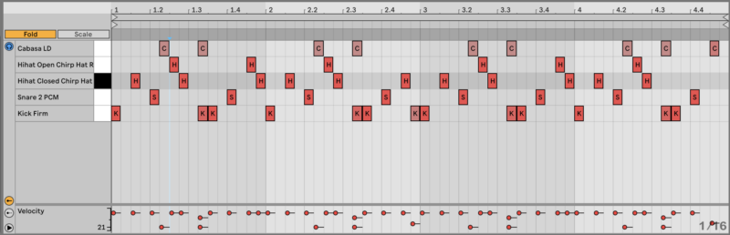 Now add an extra shaker one shot to the pattern to add extra life. Load ‘Cabasa LD’ into the Drum Rack and program it to hit like in the image below.