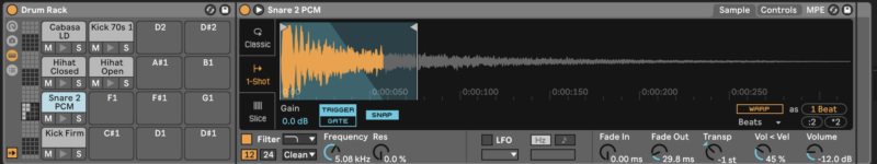 Next, let’s add a snare to the pattern. Load the Snare 2 PCM sample into Drum Rack, transpose the sample down by one semitone, trim it, and filter all frequencies above 5 kHz.