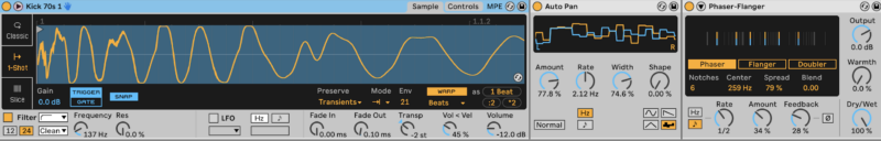 Finally, to add some more movement, we’ll place Auto Pan and Phaser-Flanger on the kick. Set Auto Pan to the random waveform and set an amount of around 75%.