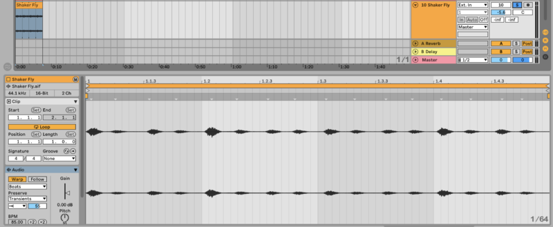 To make the hi-hat loop more rhythmic, switch the warp mode to Beats, the Transient Loop Mode to Off, and the Transient Envelopes to 55.