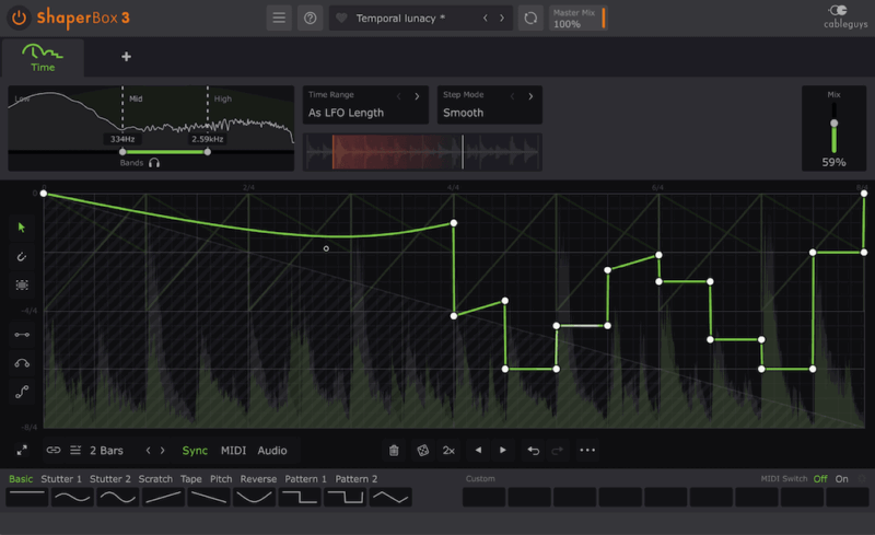The latest version of ShaperBox features 11 Shaper effects modules, including Volume, Time, Drive, Filter, Crush Noise, Pan, Width, Liquid, Reverb and the new Pitch. Each Shaper gets its own drawable LFO for creating rhythmic sweeps and patterns, either synced to the DAW track or (new in 3) triggered by MIDI. The latest version also offers a sidechain.