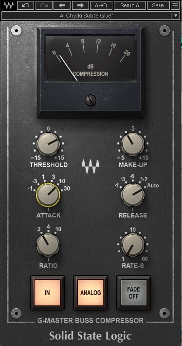 We add Waves SSL G-Master Buss Compressor to the drum group next. We don’t need to slam the drums, just give them a little nudge in the right direction, so we restrain ourselves with the settings. The Chycki Subtle Glue preset works perfectly in this capacity. It’s got a threshold of around +6, a relatively slow Attack of 10 to let the transients through, Release on Auto and a Ratio of 2. We’ve also engaged the Analog button for a little colour.