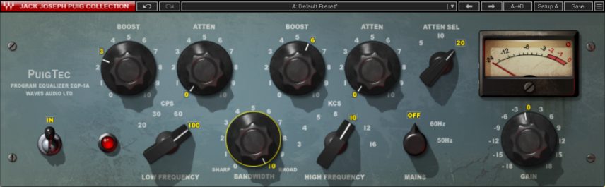 To make things easier, we group all our drum samples onto one bus for processing. We then add Waves Puigtec EQP1A equalizer plugin to the drum bus. This is perfect for baking in some delicious lows and highs. We’ve made a small boost to the lows at 100Hz and a fairly generous boost of 6 to the highs at 10kHz. Make sure to manage your gain staging on the plugin to keep things from clipping.
