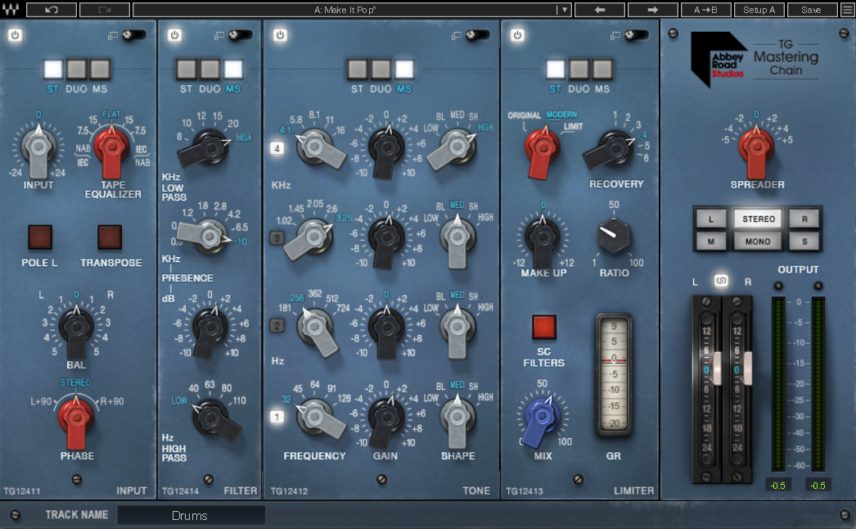 For the last stage, let’s use Waves Abbey Road TG Mastering Chain plugin to add the final bit of polish. With this, we can adjust the last stages of EQ and dynamics. The plugin has four main panels: Input, Filter, Tone, and Limiter. The signal enters at the Input stage and then passes to the EQ-style Filter. By running this in mid/side (MS) mode, we can add a boost to the bass in the centre of the audio while boosting the highs in the side. We can do a similar thing in the Tone section as well although with more bands. Finally, in the Limiter section we use the Modern compressor type to help add perceived loudness.