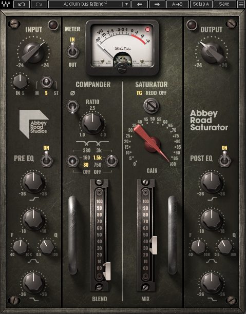 First, place Waves Abbey Road Saturator on the drum group. By cranking the Gain knob and then easing off on the Output, we can drive the saturation to add some warmth and mild compression without going into distortion. Pull down on the Blend to reduce fizz in the highs. the Ease off on the Mix amount for a less pronounced effect.