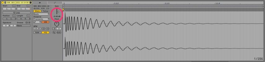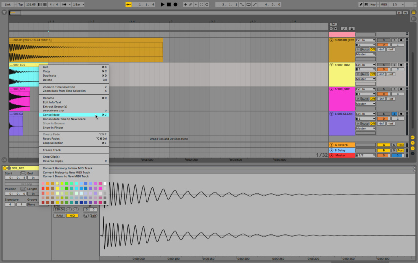 After recording, it’s a good idea to normalize the audio files to get them all to a baseline level of loudness, in this case, 0dB. Most DAWs have a normalize function but unfortunately Ableton Live doesn’t. You can either normalize them in a separate wave editor like Audacity or use the following workaround. Load the sample to be processed into your DAW and click on it. Turn off Warp. Right-click on the file in the main screen and select Consolidate. Back in the Clip View, turn off Warp again. You’ll see that it has lowered the Gain some amount. Double click on the Gain slider to bring it up to 0dB. Now it’s normalized.