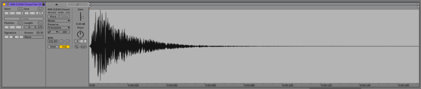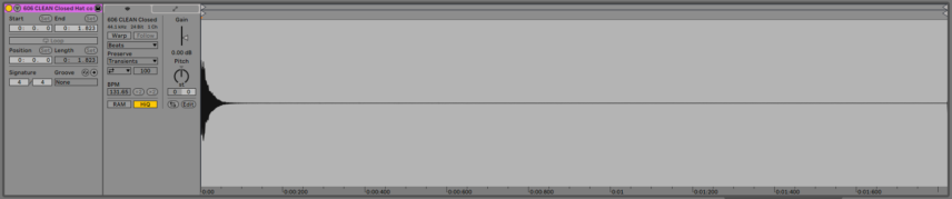 There’s quite a bit of low-frequency energy below 100Hz in the 606 closed hat sample. Even though we can’t clearly hear it we cut it out just to be on the safe side. We don’t need any low build-up making our lives difficult later on down the road. The other samples check out OK.